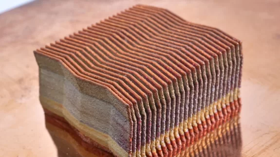 With 350 W laser power and a small spot size very thin layers are 3D printed. The result is a very small component of 21 mm x 21 mm x 10 mm out of 250 pure copper layers.